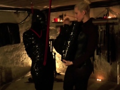 Man in a latex suit got sucked by busty blonde shemale