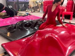 Brunette shemale in red latex dress fucks her lover